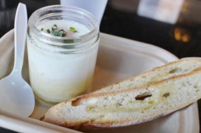 『エッグ・スラット』に行って来ました!ロスを中心に人気の「エッグスラット」発祥のお店。屋台からスタートしたお店だそうですが、人気が出て、グランドセントラルマーケット内に移転して来たそうです。朝8時の時点で、もうすでに20人程が列をなしていました!TOMAIKEは、店名にもなっている『エッグ・スラット』を頂きました。ジャーの中に、ゆる~いポテトピューレ、上に温泉卵が乗っている感じ。ジャーの中身をよくかき混ぜて、ガーリックブレッドに載せていただきます!卵トロトロで、ポテトピューレも美味しい!主人のオーダーは、『BACON, EGG & CHEESE』。ゆる~く焼いた目玉焼きのとろとろ卵とトロっとチーズがたまらないバーガーです。