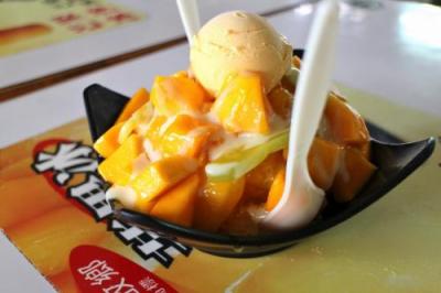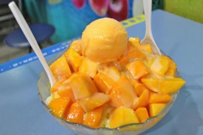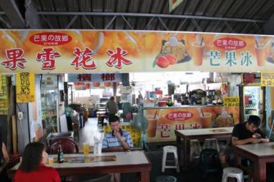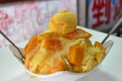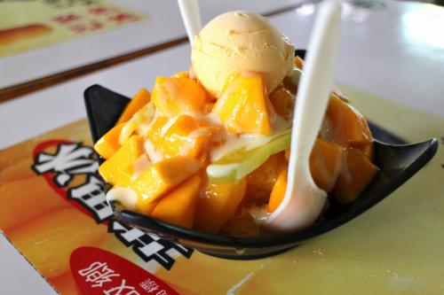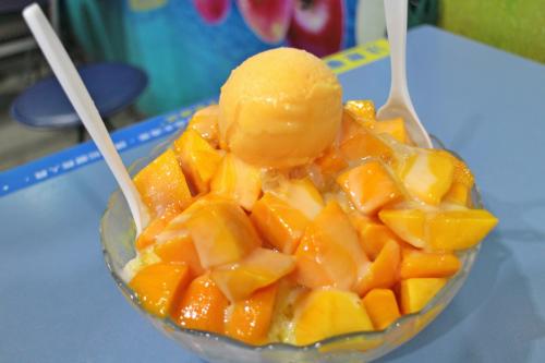 『裕成水果』に行って来ました!普段は、行列30分待ちというコトもあるそうですが、この日は小雨まじりだったせいか、まったく並ばずにオーダーできました。中国語まったくできませんが、「マンゴーピン(氷)」だけは、しっかり暗記していたので、オーダーも問題なくクリア!『マンゴー氷』は、ラーメン鉢位の大きさのガラスに、氷とマンゴー、アイスがどっさり!さすが、マンゴーの産地だけに甘い、甘い!そして、ここのマンゴーピンは、他より高いだけあってマンゴーの量がハンパない。おそらく、マンゴー3つか4つ分はあると思います。