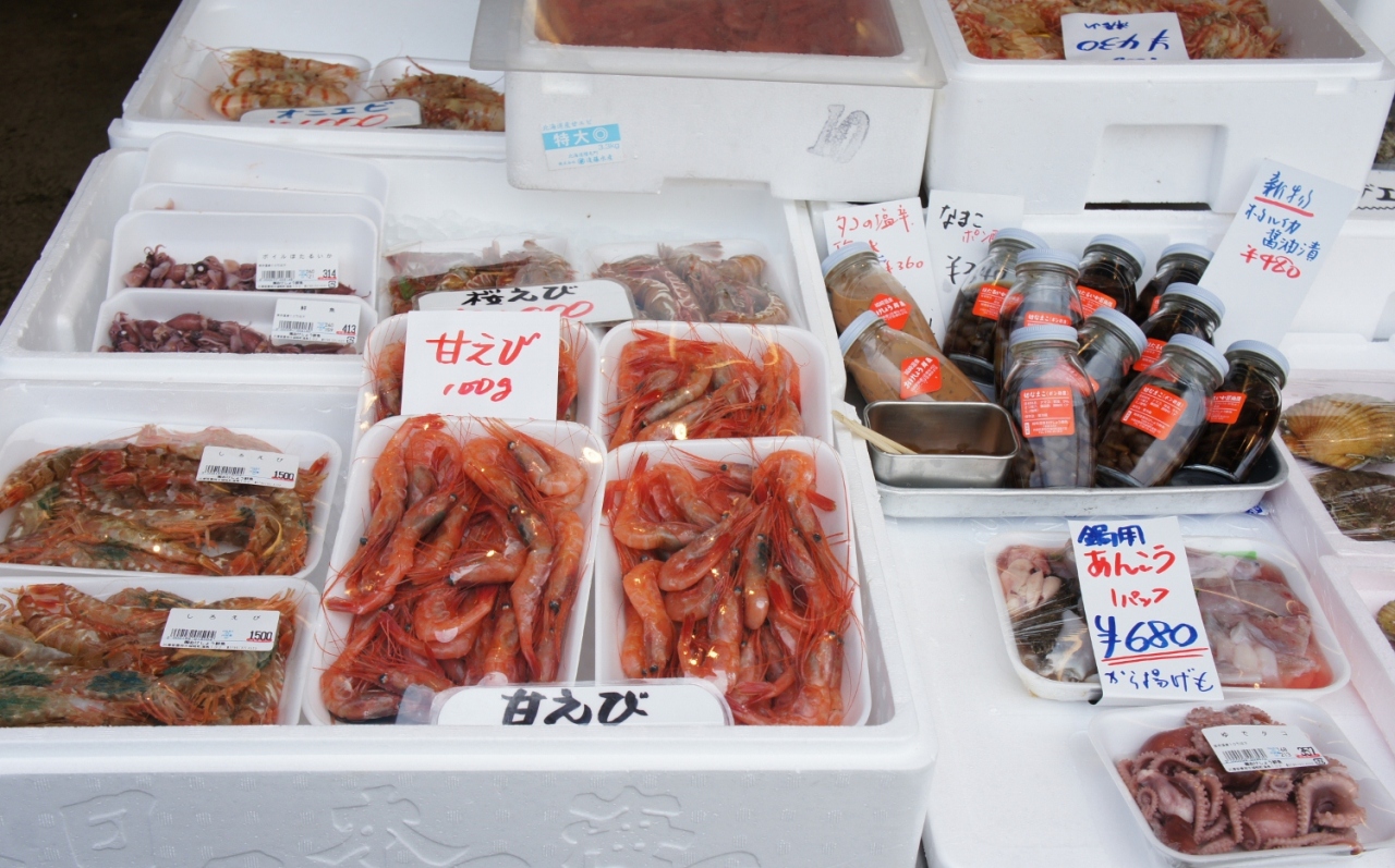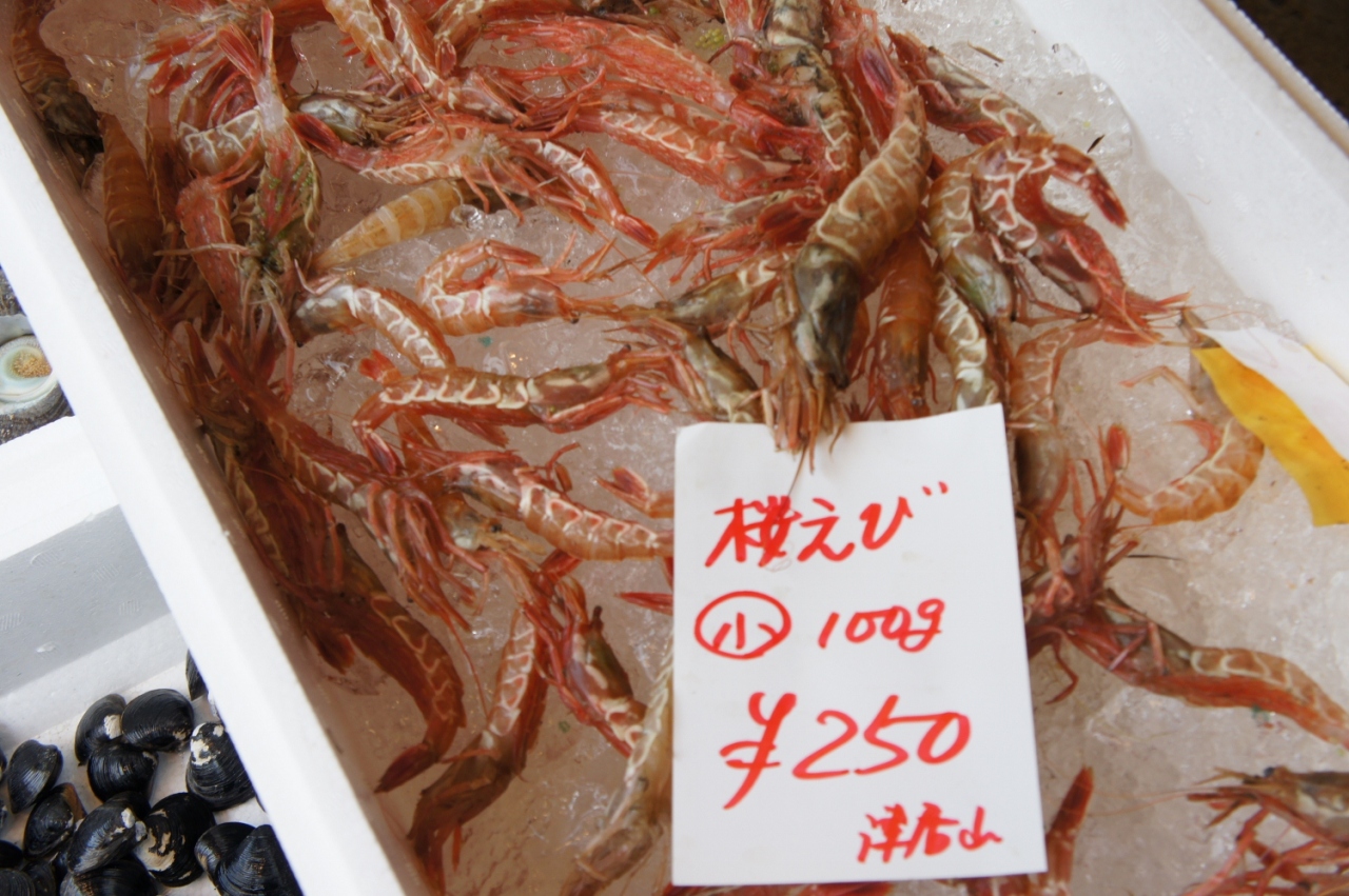 朝10時頃行くと、港で仕入れたばかりの新鮮なカニやエビがたくさん入荷したところでした!自家製のかにみそとたこの塩辛、甘エビを買ったところ、ちゃんとアイスパックを入れた保冷袋に入れてくれました!甘エビもモチロン感激のおいしさでしたが、自家製のかにみそが本当においしくって忘れられません。