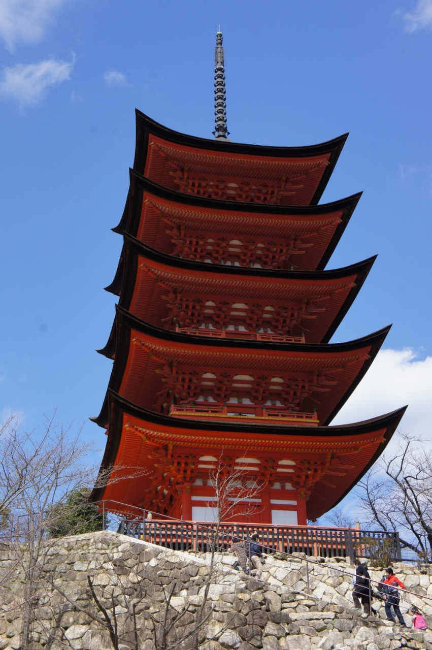 宮島の小高い山の上に「五重の塔」はあり、厳島神社からもその姿を望むことができます。朱塗りが美しい塔は、唐様と和様の建築様式が美しく調和したものだとか...。残念ながら、建築様式には疎いので、どの辺りが中国風なのか、日本風なのかは不明ですが、ひときわ目を引く建造物です。内部は非公開ですが、金襴巻きの装飾画、壁には、極彩色の仏画が描かれているそうです。近くで見るためには階段を上がっていく必要があり、バリアフリーではありません。