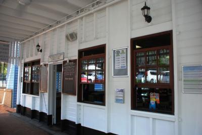 キュランダ観光列車に乗る際、始発駅であるケアンズ駅を利用しました。レンタカー利用でしたので、駅に隣接するケアンズセントラルs.cの駐車場へ車を停め、セントラル駅を探しますが、早朝はS.Cの入口はどこも閉まっていて入れず、アセりましたが、よく見ると、S.Cの駐車場から駅舎まで、スロープでダイレクトに抜けれるようになっていました。netなどでキュランダ列車の予約を予め取っている場合は、駅内にある専用窓口で引き換える必要があります。普通の窓口とは違う場所にありますので、案内板をよくチェックしてください!(日本語あり)