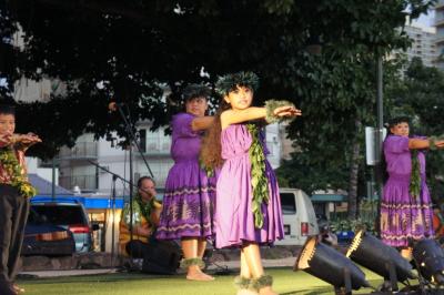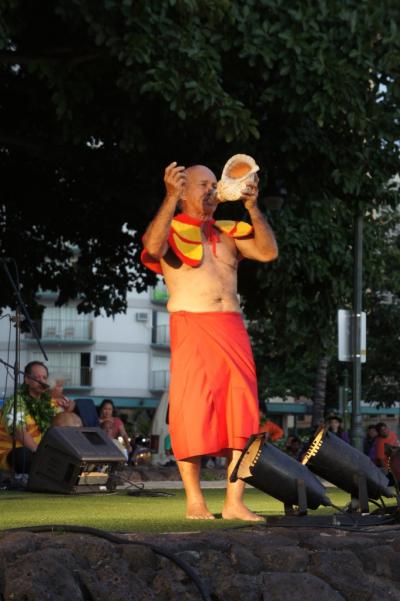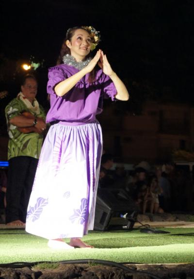 クヒオビーチで毎週火・木・土曜日の午後6時半(冬季は6時)から開催されているフラは、曜日によってはかなり有名な方も出るということで行ってきました!ホラ貝の音色でフラが始まります!クムフラ(フラの先生)の進行で、子供のフラ、女性のフラ、男性のフラ...と、次々にフラが披露されます!30分前に行きましたが、もう最前列は一杯で2列目になりました。写真撮影がしたい方は、早めの場所取りが必要かも!