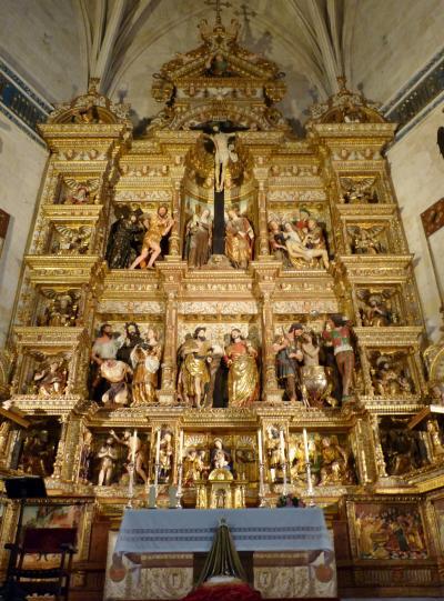 世界遺産の町ウベダの観光の目玉「エル・サルバドール教会」。16世紀のルネサンス建築の傑作で、塔はビザンチン様式。 設計はディエゴ・デ・シロエ、 装飾はバンデルビラ、 門はアルハンブラ宮殿を設計したマチュカが担当したとか。スペインらしく、しっかりシェスタタイムはクローズされます。午後4時~と書いてあったので、4時の鐘の音を聞き到着するとまだ閉まってましたが、10分後にオープンされました。見事な金泥細工にうっとり...。美しい教会です。