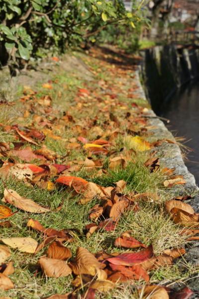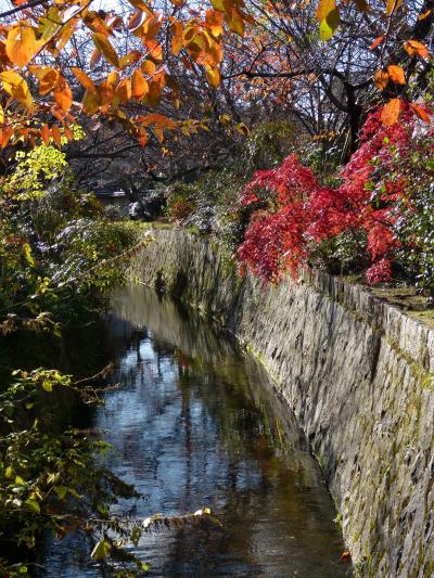 「哲学の道」といえば、桜の時期が有名ですが、紅葉の時期も人気があるとか...。ただし、モミジなどはあまりなく、圧倒的に桜の木々の黄葉や紅葉を楽しむ感じ。派手さはありませんが、落葉した哲学の道もなかなか趣があり、いいお散歩コースになっています。