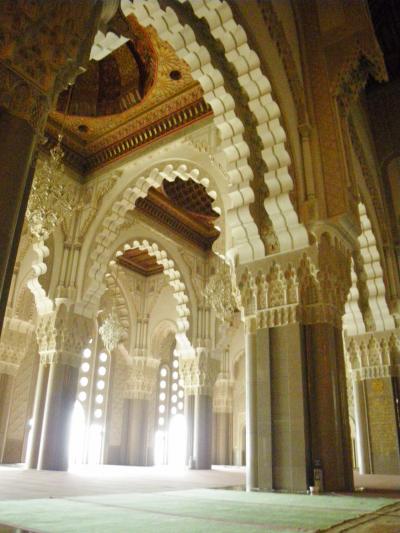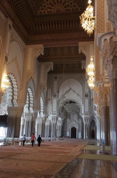 カサブランカで観光といえば...やはりここ!ホテルのあるエリアからだと、タクシーで10DH(百円)程。1993年に完成した、モロッコ最大級のモスクです。新しい建造物なので、建物自体の歴史は浅いのですが、とにかく規模がデカイ!タクシーを下りてから、広場を横切りモスクに到着するまで結構な距離があります。モロッコでは、大抵モスクの見学はできないのですが、ここは別で、決まった時間のツアーに参加することで、見学が可能です。ツアー参加は、1人120DH(1200円)と、モロッコで見てきた、どの観光スポットよりもお高いですが、豪華絢爛でなかなかの見応えでした。