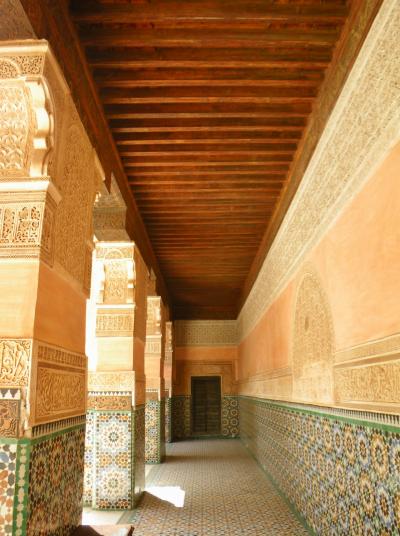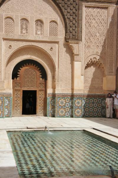 アラビア語で、「マラドサ」は学校、「ベン・ユーセフ」はユーセフの息子という意味をあらわします。フェズでも、2箇所の神学校を見学しましたが、マラケシュの神学校は規模がデカイ。20世紀中頃まで、実際に神学校として使われていたそうです。レコンキスタ(聖地回復運動)により、スペインを追われモロッコに移住したアンダルシア人の職人たちによって、こちらの美しい細工が施されたらしく、そういわれて見ると、アンダルシアのイスラム建築と似ている気が確かにしました。
