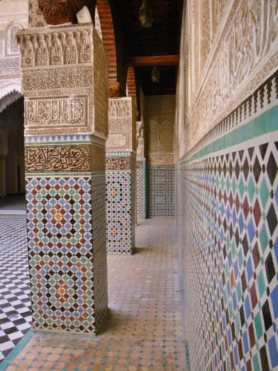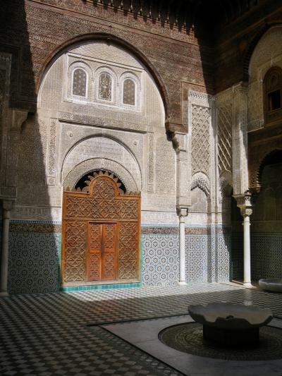 フェズには2つの神学校がありますが、こちらの神学校は、「ブー・イナニア・マドラサ」より規模は小さいものの、装飾がさらに細かく傷みも少ないので個人的にはお気に入り!屋根と壁の部分には、アトラス山地で採れたアトラス檜が使われています。モロッコでは、モスクの見学はできないところが多いので、美しいイスラム建築を堪能したかったら神学校がオススメです!