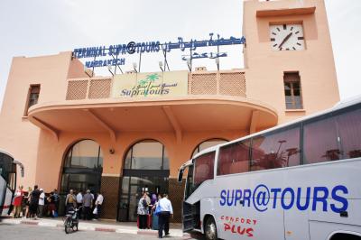 海辺のリゾート「エッサウィラ」へのアクセスはバスのみ。バスは何社か運行されていますが、中でも評判の良かったモロッコ国鉄の系列である「スープラツール」を利用しました。ホテルのコンシェルジェ曰く、繁忙期は当日だとまずチケットは売り切れというコトなので、2日前に購入しました。エッサウィラへは、夏の繁忙期ということもあり、マラケシュから日に何本ものバスが運行されているんですが、日に1本だけ「コンフォートバス」というデラックス仕様のバスが運行されています。通常料金よりは少しお高いのですが、このバスが快適そのもの!2列×1列で、クーラーの効いたリクライニングのできる革張りシートでの旅は最高です!
