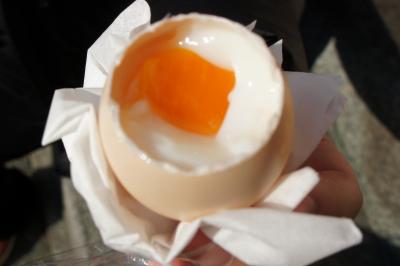 公衆温泉場ですが、今回は宿でのぼせる程温泉に入りすぎたので、今回は「足湯」を利用させていただきました!足湯にそ~っと足をつけたら熱いこと熱いこと!2人共5分も耐えられなかったのに、地元のおばさんはず~っと平気で足をつけていました...。また、「菊の湯」名物の「温泉玉子」を実際に作り食べることができるので、チャレンジしてみました!温泉成分が中に入り、何もつけなくてもほんのり塩味とうま味が感じられ美味しかったです。