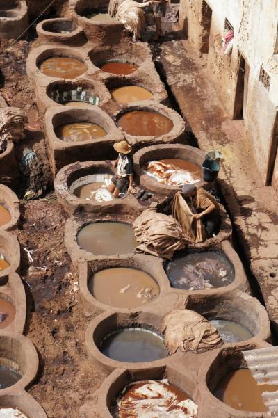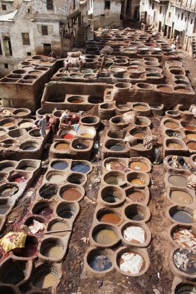 フェズには、「タンネリ」(モロッコ1の規模のなめし皮染色工場)があり、そこへ案内したがるモロッコ人が多くて、かなり疲れます...。染色をしている様子を建物の上から見るもので、タンネリを見学できる建物は工房兼ショップになっています。一通りタンネリを見学したら、セールストークが始まり、皮革製品を次々と見せられるのですが、あまり安くはなく、かつ、あまりおしゃれな感じでもありません...。ガイドブックに、商品を買わない場合はチップを...と書いてあったのでチップを払おうと思ったのですが、「何か買え」とあまりにひつこく言われたので、結局何も払わずに建物を後にしました。