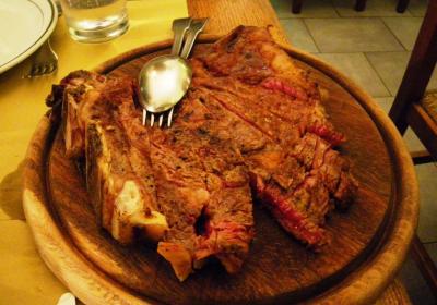 サント・スピリト地区の通称「職人通り」と呼ばれる通りに面しています。7時過ぎに入店したときはガラガラで「ハズしたかな?」と一瞬思いましたが、すぐにお店は満席状態に...地元の方も多く、人気のお店だったようです。オススメは、「ビステッカ・フィオレンティーナ」2名から注文できます。オーダーすると、厨房から「ジュー」「ジュー」というお肉を焼く音が...出てきたお肉はかなりボリューミーでしたが、柔らかくジューシーなので2人でペロリと完食でした!