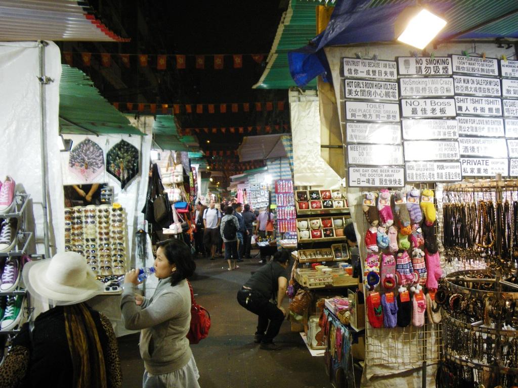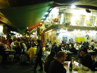 ナイトマーケットとしては、香港最大の規模だそう。細い通りの両側にずら~っと屋台が並んでいます!大阪弁で言うと、いわゆるバッタもん(ニセモノ)のお店ばかりですが、縁日を眺めているようで、歩いているだけでわくわくします。ローカルフードを味わえるお店も多く、オープンエアのテーブル席はどこも超満員!欧米のお客さんばかりのテーブルもあったので、味がどうなのかはいささかギモン...