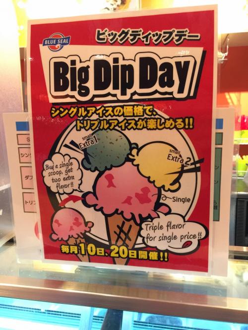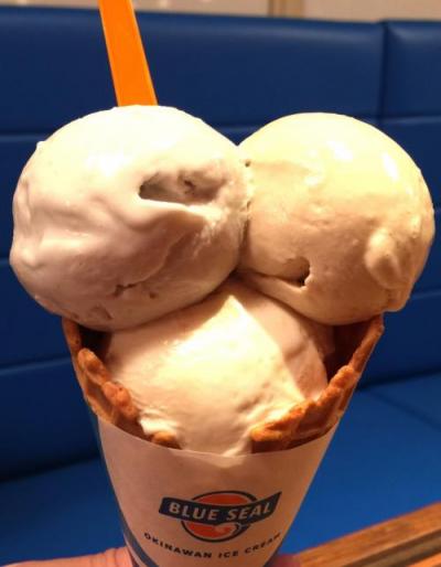 デザートを食べに、「ブルーシール名護店」に行って来ました!「アメリカングラフティ」を思わせる、ポップな店内は明るくて楽しい雰囲気。10日と20日は、シングルを買えば、2スクープがおまけで付いてくるというキャンペーン中で、思わずこのパターンでオーダーしました。フレーバーも豊富で、美味しかったです。