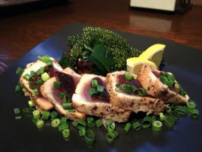 ホテルから徒歩3、4分程の場所にある「家守屋」さんでディナーをいただきました。6時の予約で、伺うと、夕陽を楽しめるこんな良い席に案内してもらいました。『マグロのタタキにんにくシークヮーサー醤油』、『かりっと焼いたラフテー』など創作沖縄料理が多くあり、それぞれがとても美味しかったです!