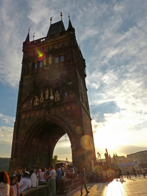 旧市街を抜け、カレル橋に入る手前に、「旧市街橋塔」が見えて来ます。ちょうどサンセットタイムに行ったので、塔の周りは観光客だらけ!とかくカレル橋の方に目が行きがちですが、こちらの塔の装飾もなかなか見事!塔に昇ることもできますが、入口が狭く混んでいたので今回はスルーしました。
