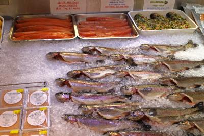 虹鱒の養殖池はあんまり興味がなかったんですが、ここもお庭がとってもキレイなので、散策がてら入場してみました(有料)。こちらのトラウトファーム...なんと100年以上もの歴史があるんだとか。併設して、虹鱒料理が食べられるカフェもあり、とてもいい香りが辺り。中に入ると、虹鱒の切り身や燻製等を販売しているSHOPもあり、結構次から次へとみなさん買いに訪れています。広~い敷地の中には、こんな感じの養殖池がいくつも並んでいて、カモたちや白鳥たちものんびり羽を休めています。