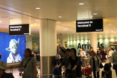 入国審査の列が凄いと聞いていたので、ゲートを出た途端早足で入国審査場へ急ぎました。空港内は広く、かなり歩いて入国審査場へ...。そこは、まるで東京ディズニーランドのアトラクションを待つ列のよう。「ここから1時間待ち」、「ここから30分待ち」という表示まで同じ。30分待ち付近から並び始めて、20分程で順番がやってきました。イギリスの入国審査は、あれこれ沢山質問されると聞いていたので、どの質問も即答できるように予め書類を用意して臨みましたが、私たち夫婦の審査官は当りだったようで、特に質問はなく「滞在は7daysね」と言ったのみで、終了でした。審査官によって、審査内容の厳密さはかなり違うようで、同じ日本人でも、延々と質問されている方もいたので、気合を入れて臨むに越したことはないと思います。