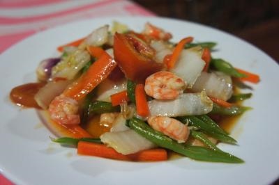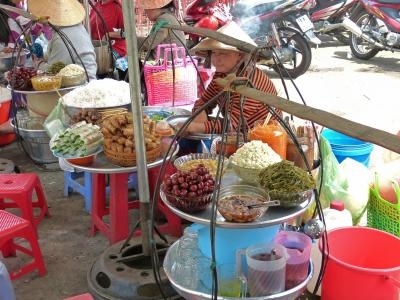 「ズン」のあるファンチューチン通りは、別名「コム・ガー」通りと呼ばれています。オススメの「コム・ガー」をオーダーすると、鶏がらスープで焚いたごはんの上に、チキンと香草がどっさり載せられ登場!紅白なますのような野菜と、たれをかけて食べるようで、あっさりとした味わいでおいしかったです。ホイアン滞在中、ここが1番ローカルなお店で、1番安かった。お料理4皿とドリンク2人分で、16万5千ドン(780円)!