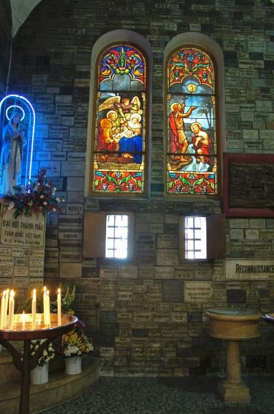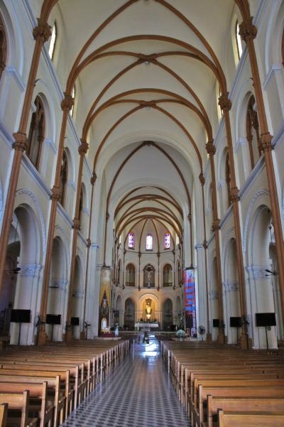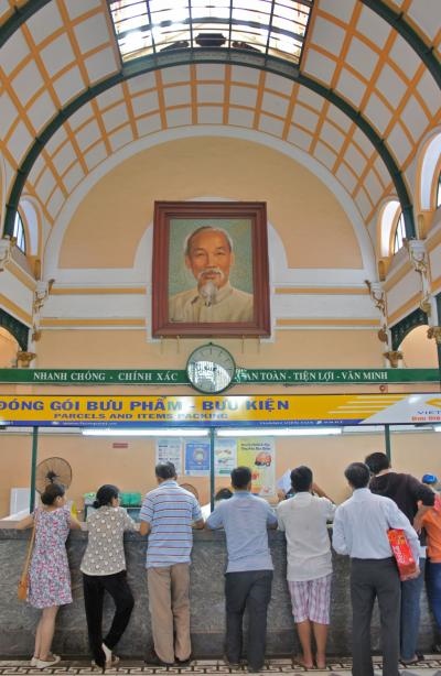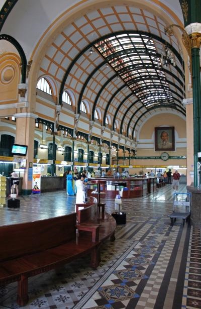 「中央郵便局」に行きました。19世紀末、フランスの統治下時代に建てられた建物で、パリのオルセー美術館(当時駅舎)をモデルにしたといわれています。鉄骨設計は、あのギュスターヴ・エッフェルが手がけたとか...。正面から入ると、アーチ形に造られた天井は奥行きがあり、駅舎といわれれば、確かにそんな造りに見えてきます。アーチの正面には、ど~んと飾られた大きな「ホーチミン先生」の肖像画があり、インパクト大です。