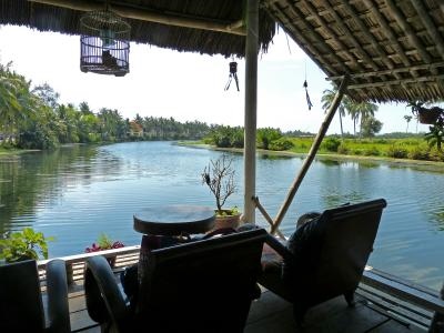 「SON Hoian」でカフェ休憩を行いました。自転車で「クアダイ・ビーチ」に行った際、良さげなカフェを探したんですが、意外となくてようやく見つけたのが、このお店。海沿いではなく、川沿いに建つレストラン。イメージ的には、「カリブの海賊」で登場する家のよう...。やしの葉が葺かれた屋根といい、竹の床といいかなり野趣あふれるイメージ。