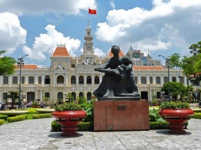 人民委員会というのは、ベトナムの行政機関の名称であり、市役所といった感じです。南ベトナム時代には、サイゴン市庁舎として使用されていました。1901年から1908年にかけて建造されたイタリア・ルネッサンス様式の建物は、夜のライトアップも素敵です!ただし、近くからの建物の撮影は禁止なので、ちょっと離れて撮影しましょう!前の広場には、ホーチミン先生の像もあります。