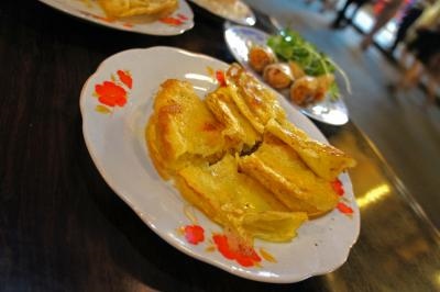 クチコミで評判の良かった「チュン・バック」でディナーをいただきました。ホイアン名物の「揚げワンタン」、「ホワイトローズ」と、これまたベトナム料理の定番「揚げ春巻」をいただきましたが、どれもおいしかったです!揚げワンタンは、トマト味のソースがかかり、ちょっとタコスのような味わい。ホワイトローズは、海老蒸し餃子の開いたバージョン。ベトナム版お好み焼き「バインセオ」は、パリパリの皮の中に、千切りのじゃがいもやもやしがはさまれていて、食感が楽しい料理でした。この日のディナーは、料理5皿&飲物で1500円程。かなりお手頃プライスでした