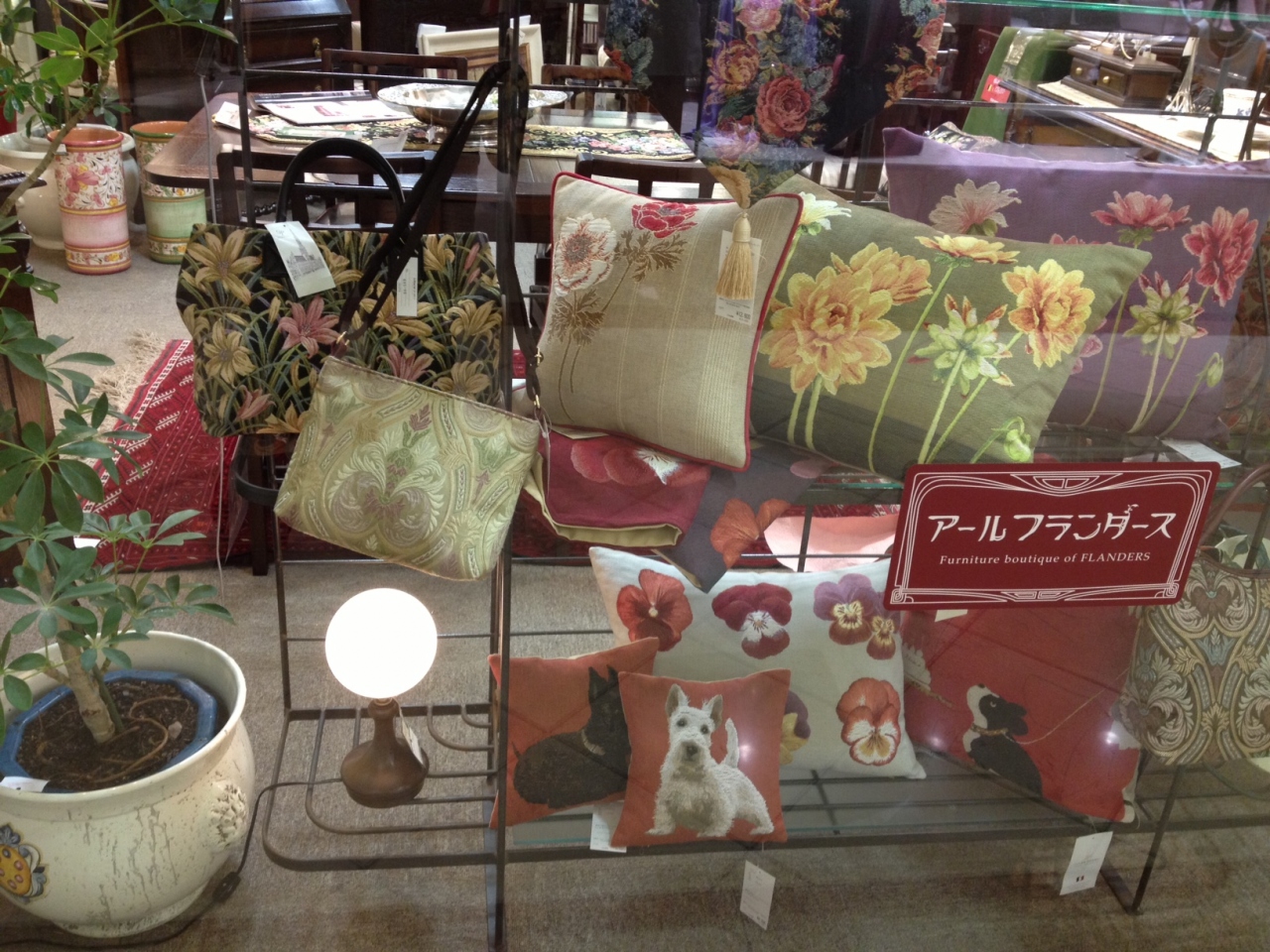 宝塚阪急の中にあるお店ですが、結構奥まった場所にあるので、ずいぶん長い間その存在に気付かなかったお店です。「アールフランダース」というネーミングから、オランダの家具屋さんかな~?と思いましたが、英国製のアンティーク家具などもあり、幅広いラインナップでした。家具だけでなく、クッションカバーやバッグなどの雑貨もあり、いろいろ見ているだけで楽しいお店です。