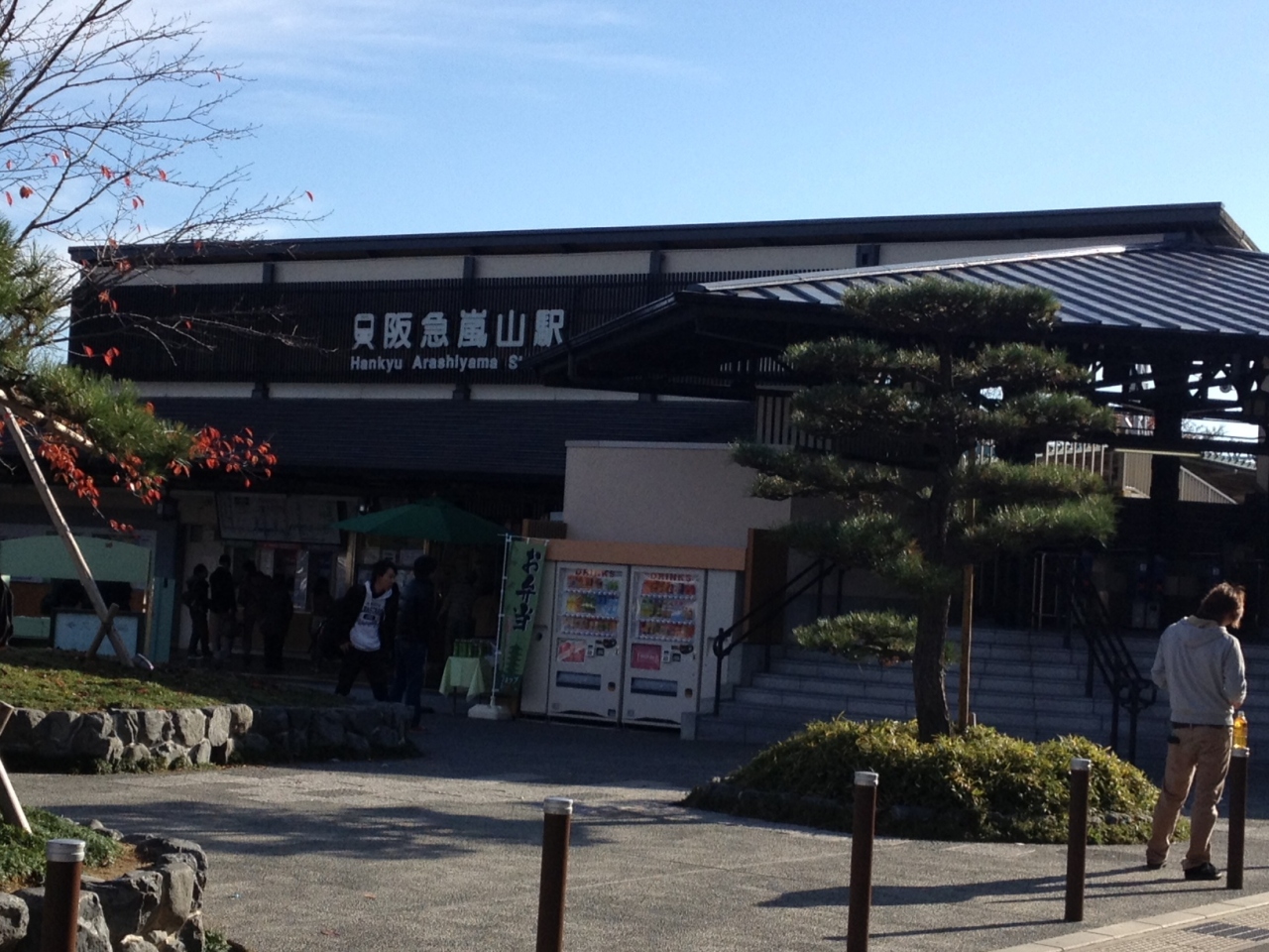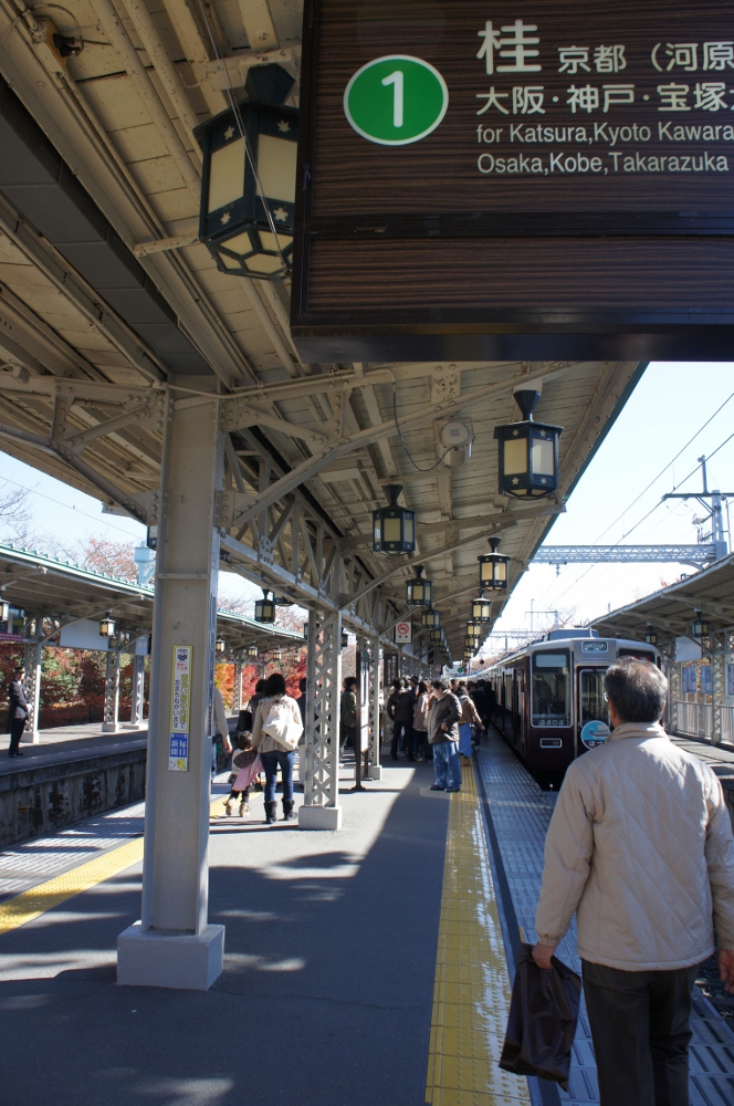 嵐山に行くには、阪急電車か京福電鉄のどちらかを利用することになります。景勝地のお寺などは京福電鉄の方が近くて便利ですが、阪急嵐山駅始発で各種バスが出ていますので、バス利用なら断然阪急をお勧めします。紅葉の時期には、ここから「西山高雄」方面への臨時バスも運行され、大盛況です。
