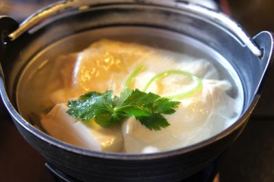 鳥居本にある「茶寮 弁治」さんでランチをいただきました。4組すでにお客さんが待たれていましたが、お庭で座って待つカタチなので、らくらくでした。日本庭園をぼや~んと見ながら、待つこと10分程で呼ばれました。メニューは、「湯どうふ膳」オンリーなので、座ると同時位にさっと出てくる感じです。座敷の他、テーブル席もあります。黒米ごはん、生麩田楽、生湯葉、しば漬け 湯豆腐...以上で1900円です。観光地プライスの嵐山の中で食べる「湯どうふ膳」の中では、まだ安い方かもしれません。普通においしい感じです。