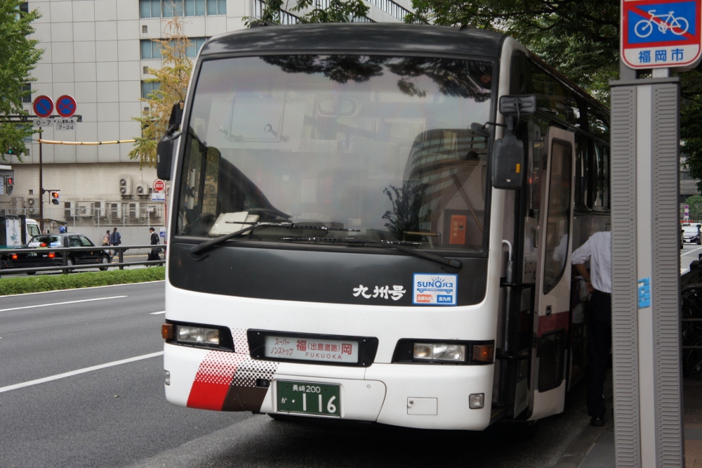 九州のあらゆるところを網羅している高速バス。便数も多く便利です。今回は、長崎から福岡駅まで利用しました。博多まで高速を走って2時間ちょっと。電車よりも安く、時間はほぼ同じならバスを選びます。1×2席シートでトイレ付。