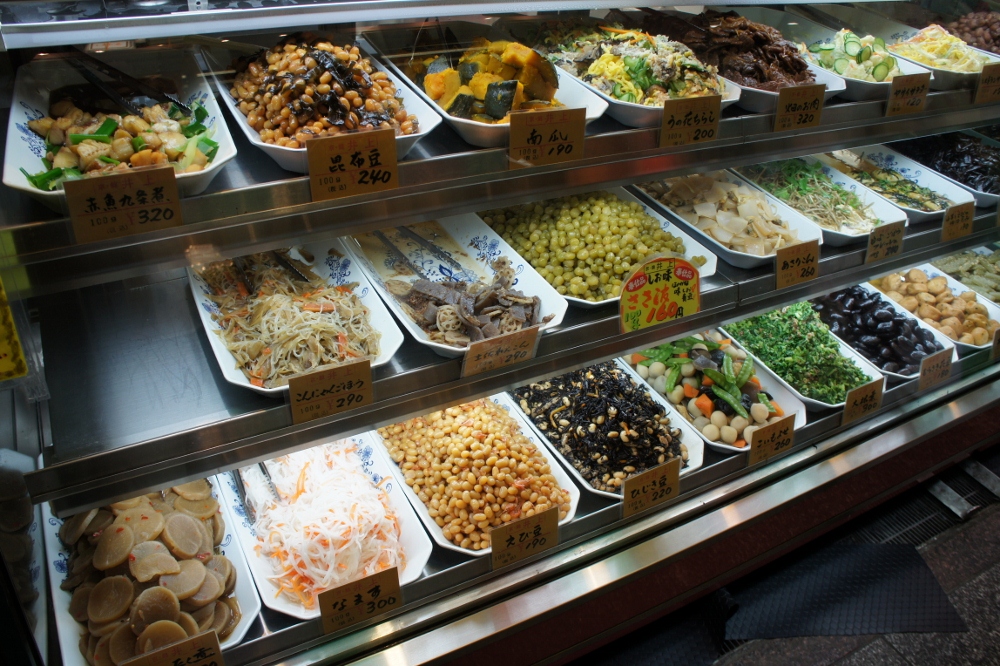 京都の台所「錦市場」の中にあるおばんざいのお店です。京都弁でいうところの、「お野菜の炊いたん」がズラーっとショーケースに並んでいます。どれも薄口で、色味もきれい。スーパーなどでもお惣菜は買えますが、ここのは素材や味付けが全然違う感じで、本当においしいのでオススメです!