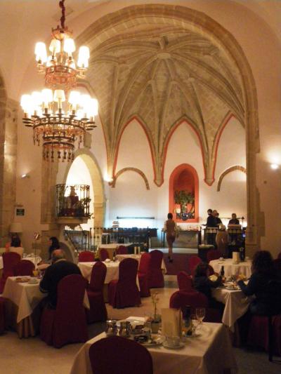 私が今まで行ったパラドールの中で、最もインパクトの強い朝食ルームがパラドールトルヒーリョのレストラン! 元教会の建物が、そのままレストランになっています。オペラが静かに流れ、なんだかおごそかな雰囲気さえ漂っています。ビュッフェはかなり豪華で、温かい食べ物は、保温プレートで保温されています。