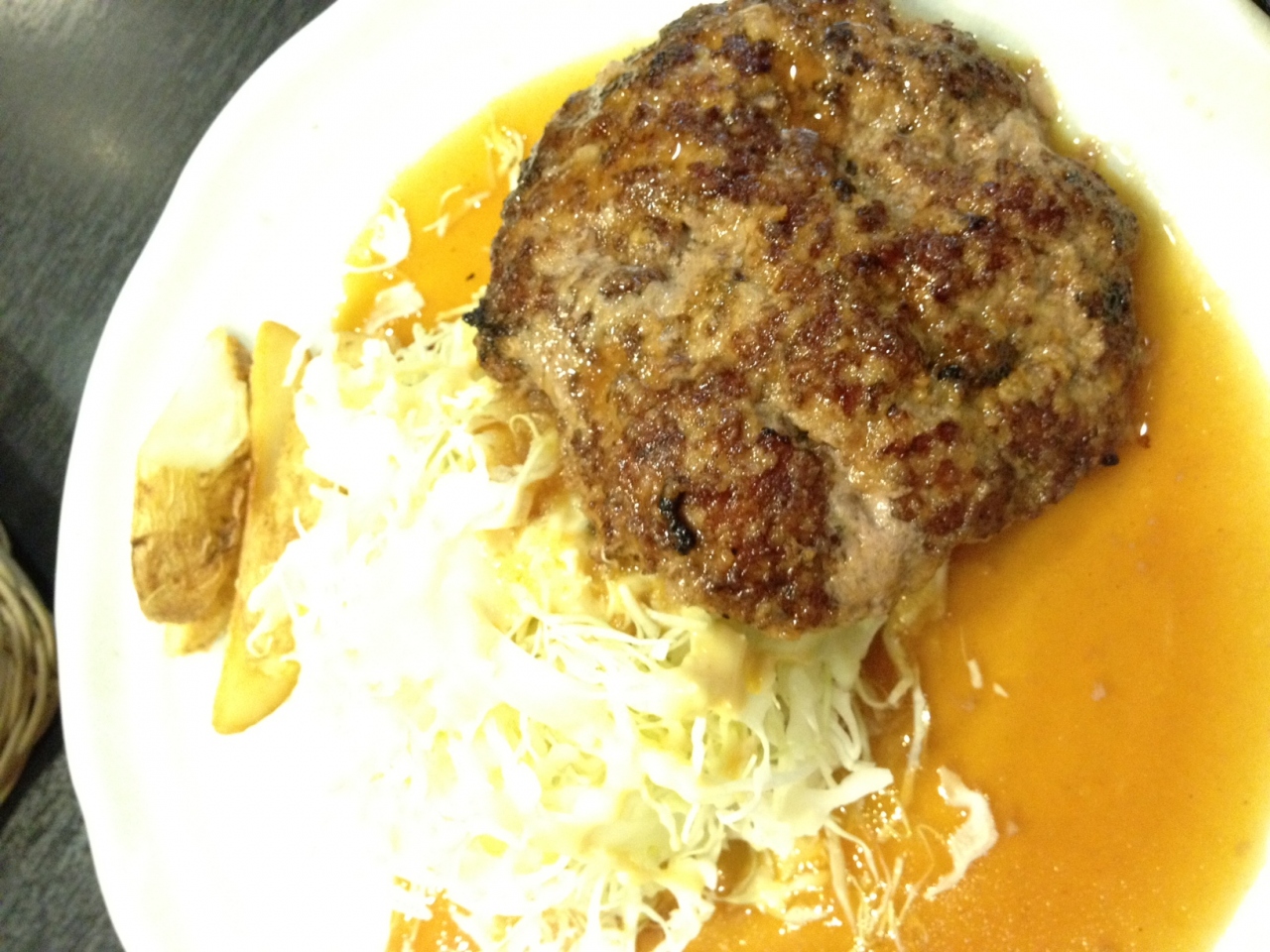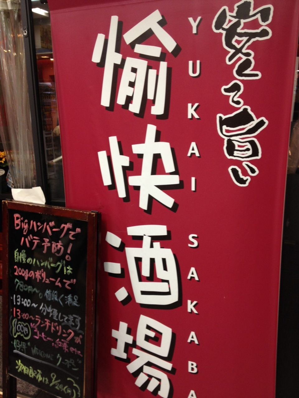 ドウチカにある居酒屋「愉快酒場」でランチをいただきました。夜は居酒屋、昼はお手頃価格のハンバーグで有名なお店です。200グラムのパテは、かなりのボリューム。ご飯の盛りもいいので、男性でもお腹一杯になる感じ。ドミグラスソースではなく、甘めの照り焼き風ソースです。ふわふわ系のハンバーグが好みの方にオススメのお店。