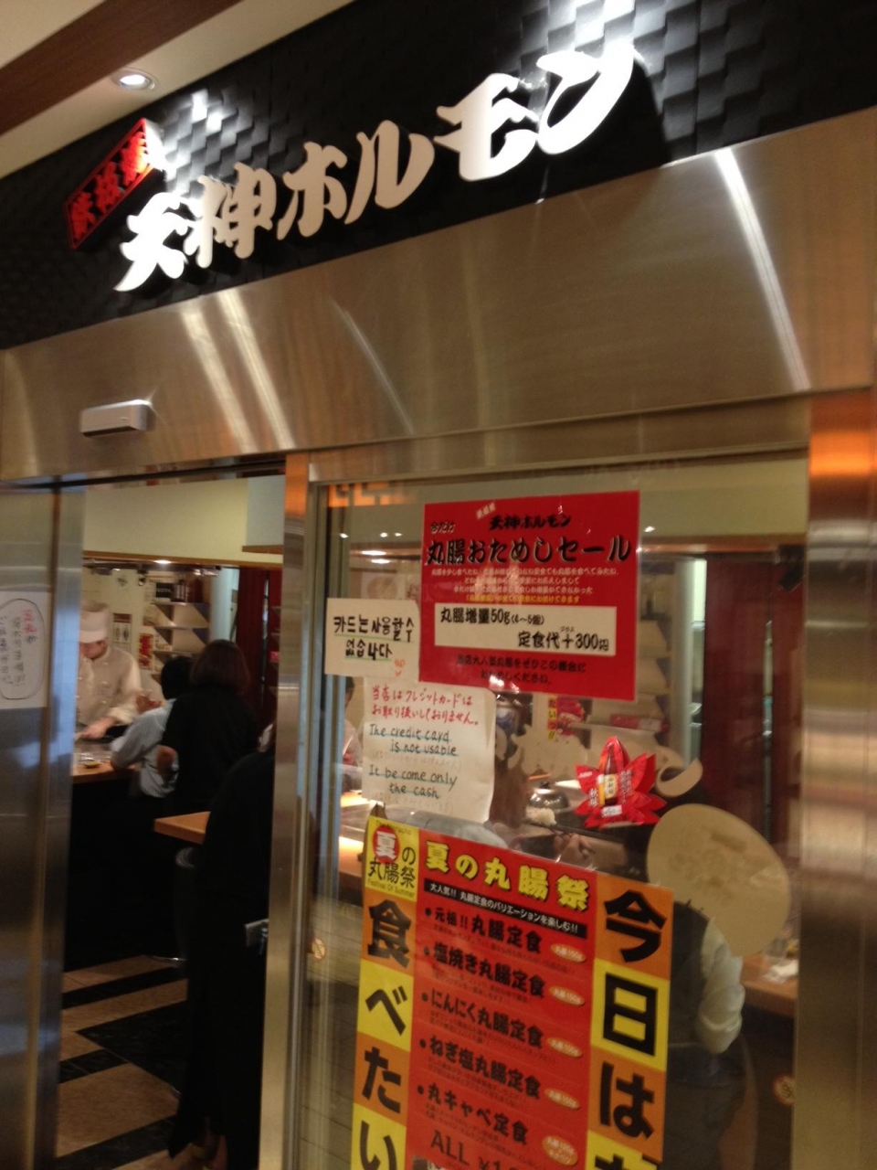 博多駅にある「天神ホルモン」でランチをいただきました!博多でホルモンといえば、「モツ鍋」を想像しますが、ここのは鉄板焼きでいただく「ホルモン」です。大きな鉄板でシェフがステーキみたく「丸腸」をぷりぷりジューシーに焼き上げてくれます。ホルモンの苦手な方は普通にステーキもありますが、ほとんどの方は丸腸をオーダーされています。