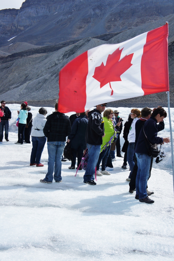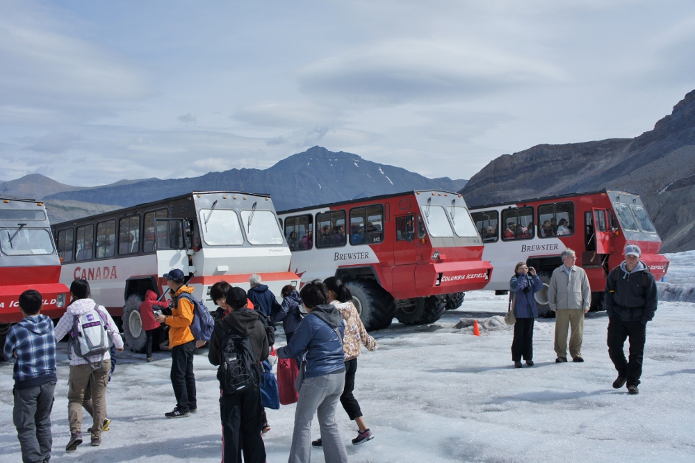 個人旅行だと結構並ぶとのクチコミでしたので、7時にホテルを出発し向いました。いろいろ写真スポットに寄りつつ、コロンビア大氷原のビジターセンターに着いたのが午前11時。まだ早い時間だったせいか、団体旅行のゲストは少なく、チケット購入後、即大氷原ツアーのバスに乗ることができました。真夏とはいえ、氷河の上は結構冷えるので、ユニクロのヒートテックとダウンジャケットが大活躍!おかげで寒さはまったく感じず、氷河を時間一杯まで堪能することができました。