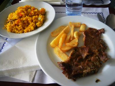 スペインとポルトガルの国境にある、スペイン側のサービスエリアです。給油とランチを食べるために立ち寄りました。ガソリン代は、ポルトガルよりもスペインの方が安いという情報を得ていたので、ポルトガルに入る手前で給油を行いました。セルフなのに、ガススタの方がすぐに出てきてくれて、頼まなくても入れてくれました。バルでは、ランチのセットがあり、パエリャとポークのソテーのセットをいただきました!出来立てのパエリャは、具沢山で結構おいしかったです。