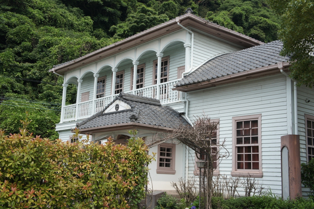 旧芹ヶ野島津家金山鉱業事業所だった建物を移築したもので、2階にあるアーチ型のテラスや淡いペパーミントグリーンの外壁がなんとも言えずレトロな洋館です。入口の上に、島津家の家紋「丸十」がど~んと飾られています。「現 磯くわはら館」と書かれていますが、実際には2012年4月に移転したため、この名称は正しくありません。中でお茶でもと思っていましたが、閉店中のため、中には入れませんでした。