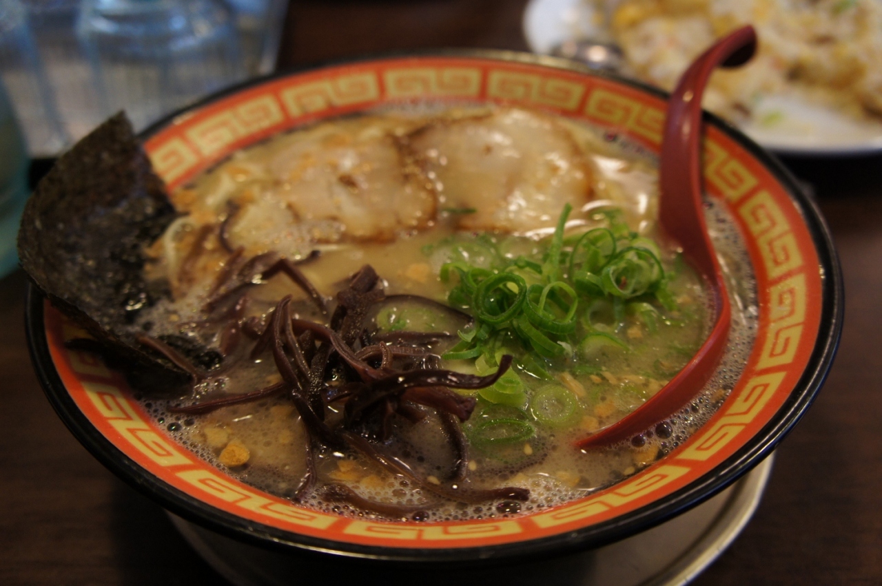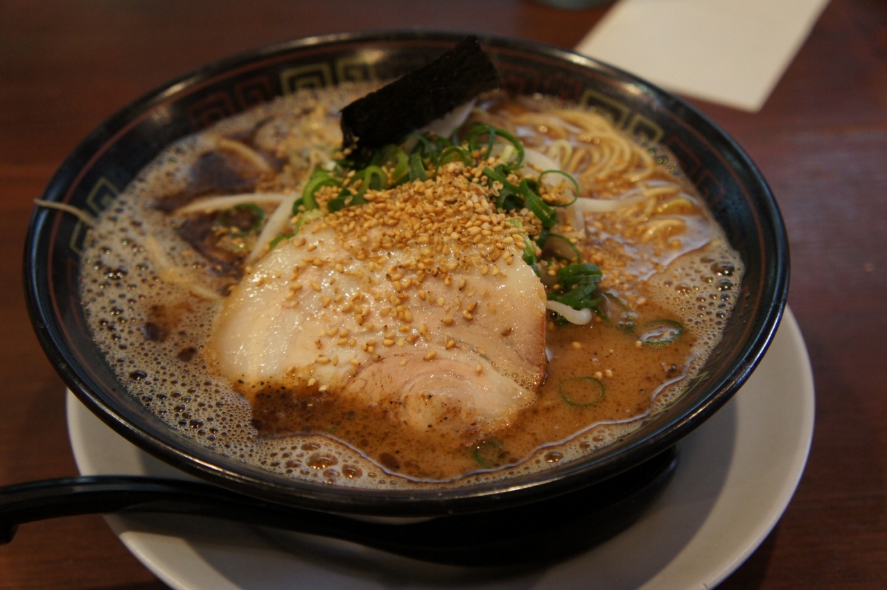 久留米ラーメンでググッたところhitしたお店です。11時30分頃到着すると、お店の前にはすでに行列が...。駐車場も一杯で、近くにある臨時駐車場に車をとめました。黒とんこつラーメンをオーダーし、一口目の感想は「おいしい!」ですが、食べ進むうちに、とんこつ特有のぎとぎとが口に残る感じで、くどく思えてきました。お水の代わりに冷緑茶が置いてあり、これを飲みながら食べると口の中がさっぱりします。