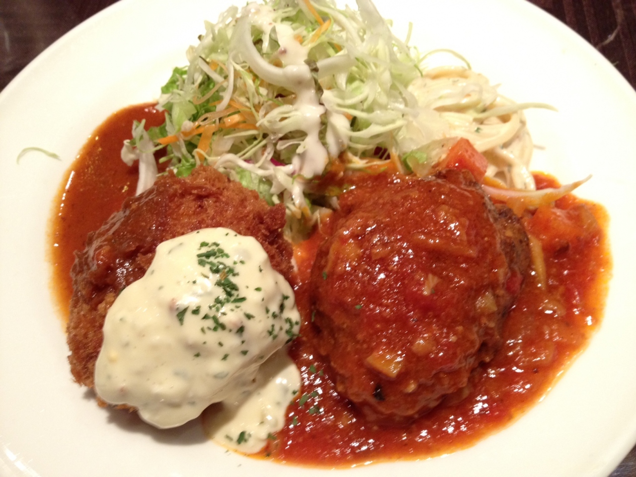 駅ビル内にあるフレンチのお店「いわむら」。堅苦しくなくカジュアルにフレンチがいただけるお店で人気がありますが、オフィス街のど真ん中とあって、ランチも非常に充実しています。フレンチシェフの作るランチが、800~850円でいただけるのは嬉しい。1番人気の「ハンコロセット(ハンバーグ&ミートコロッケ)」を頂きましたが、ソースも本格的で、お肉はジューシー...とてもおいしかったです。