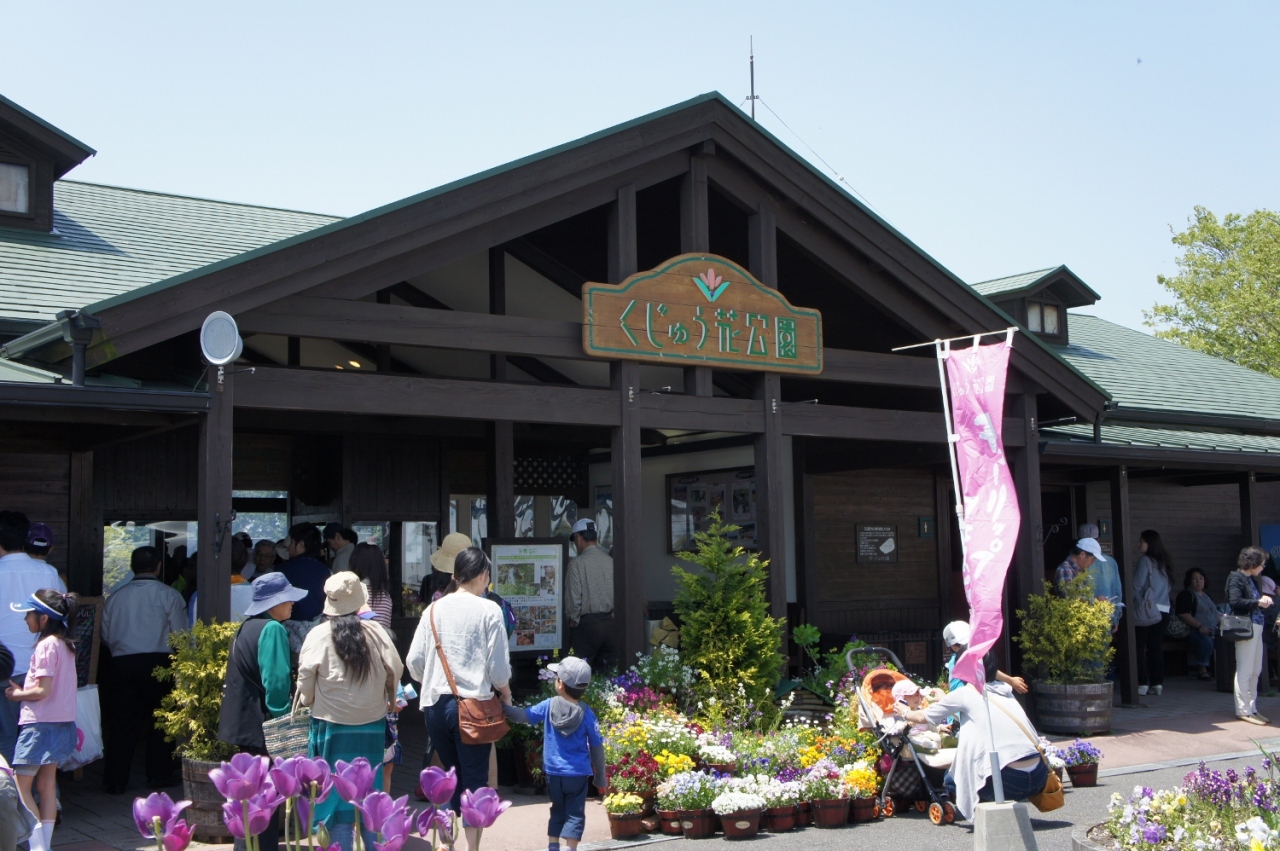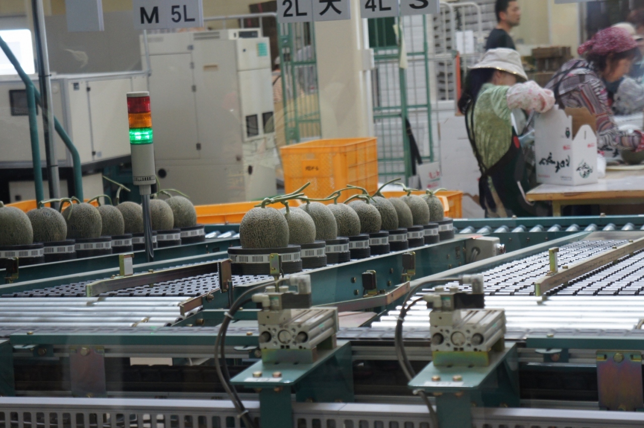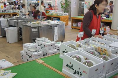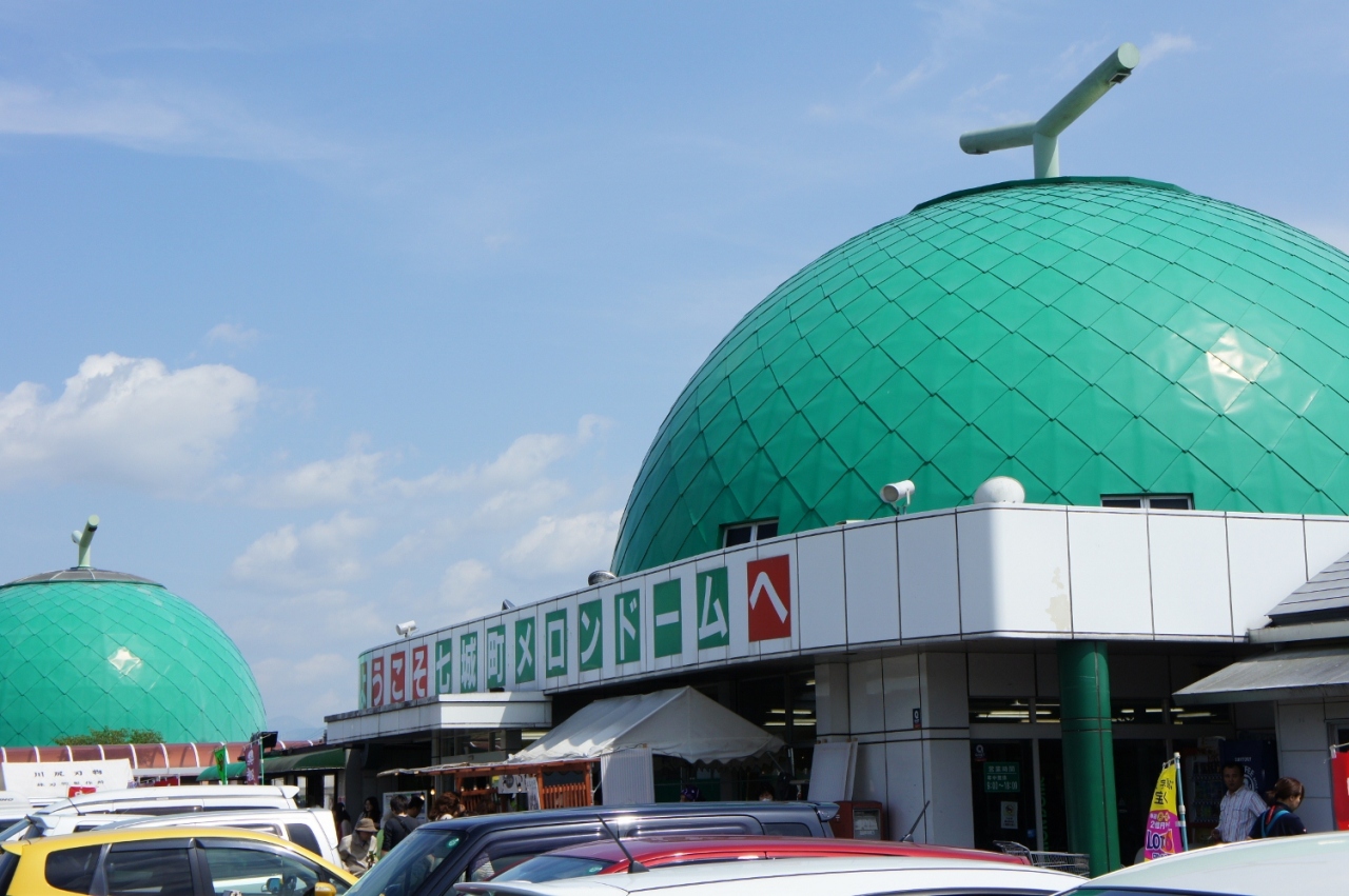 外観から「メロン」そのもの!中も、半分以上がメロンの即売所になっていて、各農家さんごとに売り場が分かれていました。地元のお客さんも多く、人気の農家さんは結構な人だかり。メロンは、全て光センサーにより糖度検査を行い、糖度の足りないメロンは売り場に並ばないとか...。試食もできるので、お気に入りのメロンを買うことができます。北海道の赤肉メロンと比べると、ずいぶん割安でした。