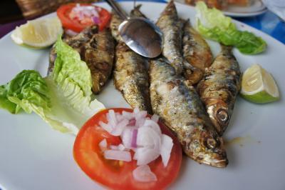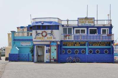 エッサウィラ港の1番先端にあるシーフード店「CHEZ SAM」に行きました。85DHと200DHの定食があったので、85DH(約850円)の定食をオーダー。まだ早い時間だったせいか、店内は空いていて、海側の良い席に案内してくれました。窓の外は海!リゾートというより、どちらかというと、景色は「おやじの海!」という感じですが、久々の磯の香りが心地良かったです。いわしのサラダ、いわしの炭火焼き、タラのフライ、デザートで850円!モロッコでいわしを満喫できるとは想像していなかっただけに、大満足でした!