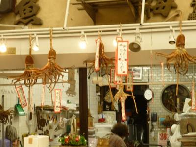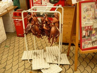 そして明石のタコ!いたるところにタコ。生タコ、茹でタコ、干物、せんべい...