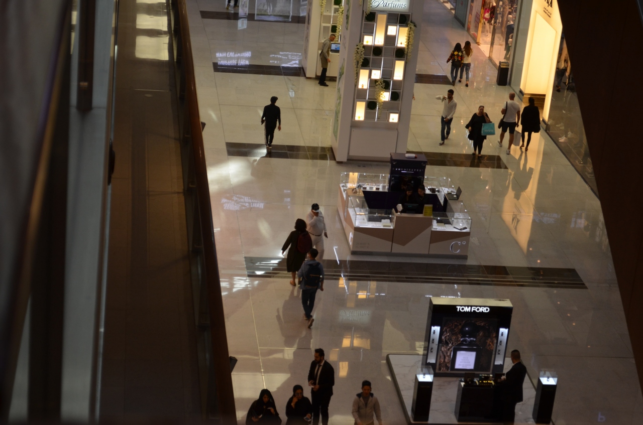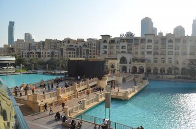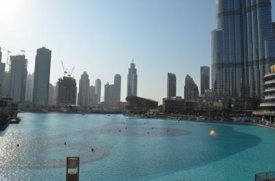 噴水の上がらない時間帯に見ても感心します。ブルジュ・ハリファなどの高層建築が立ち並ぶ近未来的な景色を背にして、広々とした水面が広がっています。砂漠の国ですから、水、特に淡水に対する憧れが背景にあるのでしょう。