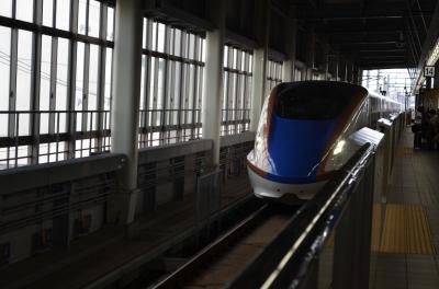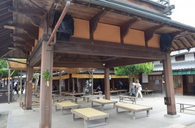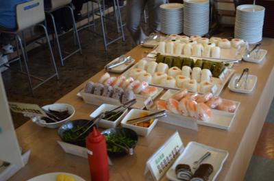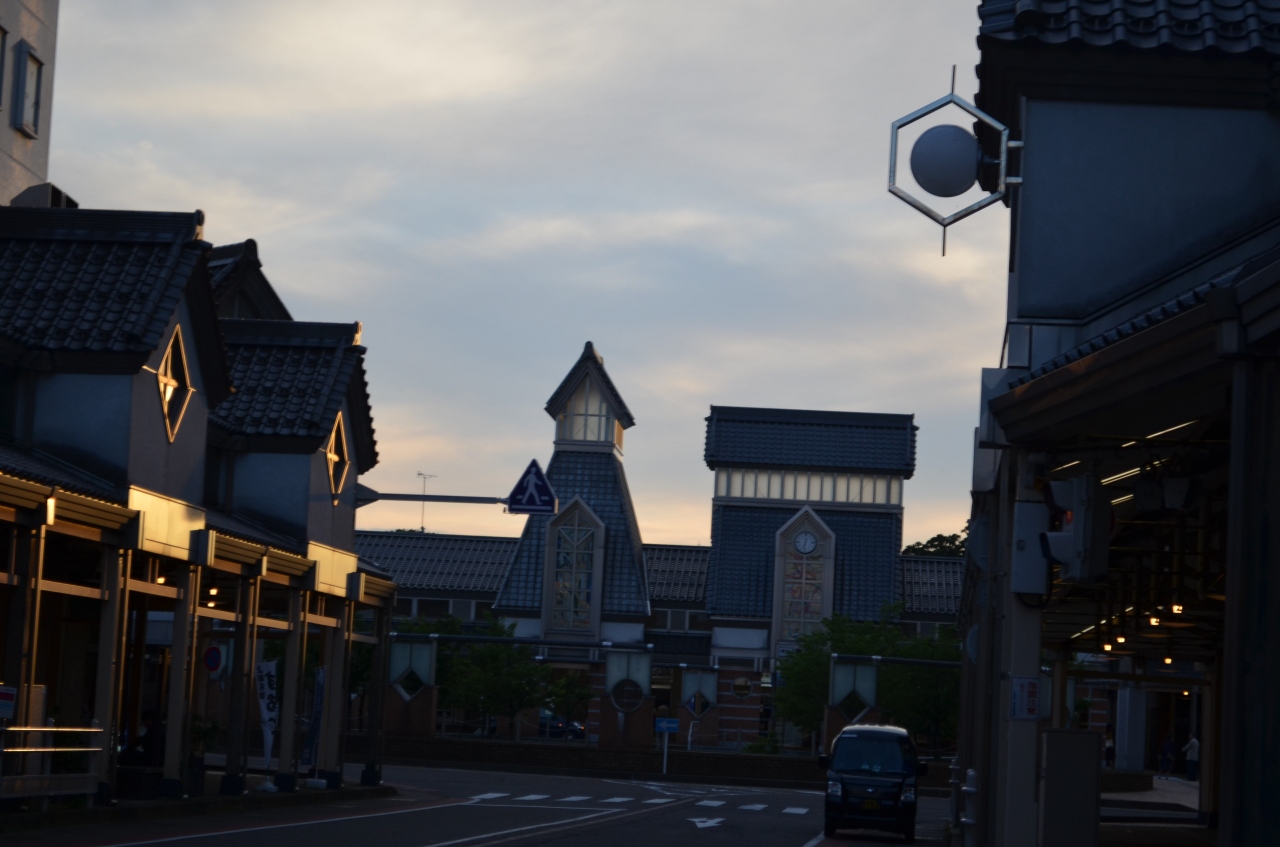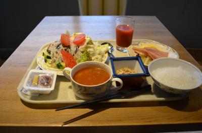 停車している新幹線車内から見えるぐらいですので、探す手間は要りません。駅出口からは歩いて三分ぐらいでしょう。部屋は狭く、十四平米ほどと思いました。部屋に備え付けの寝間着は上下が別になった作務衣型で、「これを着て朝食会場に行かないでください」という注意書きがありました。朝食は料理の種類が少なく、例えばご飯はお握りしかないという具合です。