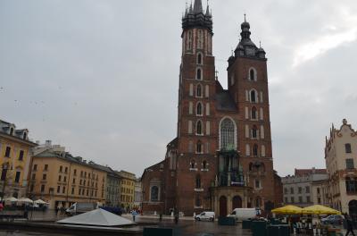 ポーランドの古都、クラクフの旧市街にある教会です。様式と時代の異なる二本の塔が目立っています。中央広場は城内の大きな面積を占めており、中世の建築がそのまま残っています。その広場でも一際、異彩を放つ建物です。