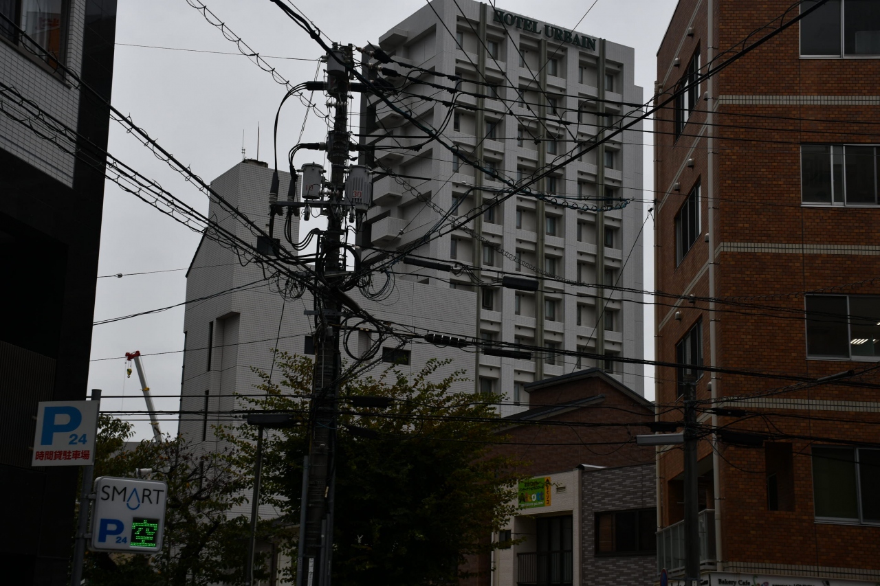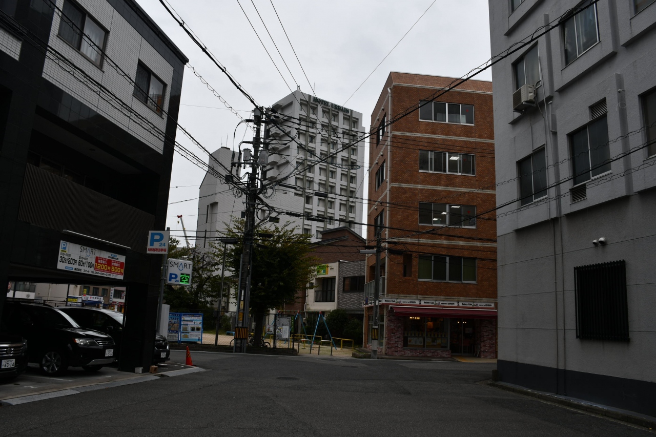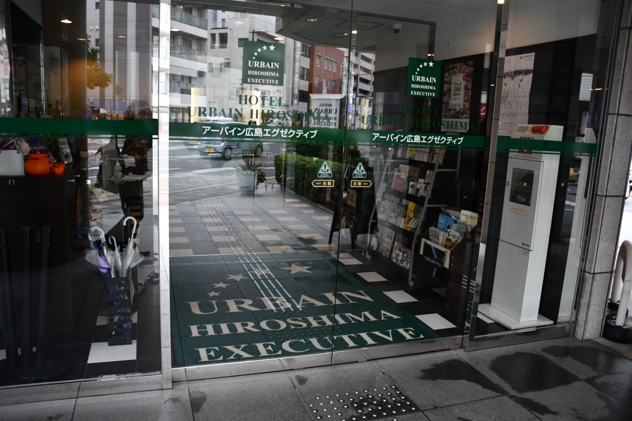 広島駅新幹線口から歩いて五分ほどのお宿です。駅直結の二階通路から地上に降りて、右に進みます。建物中央が吹き抜けで、周囲の壁も外に向かって開いているという構造でした。客室は周囲にあります。朝ご飯付きでした。