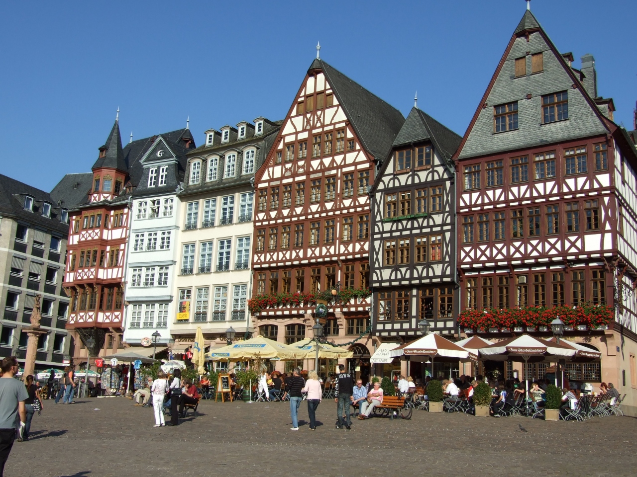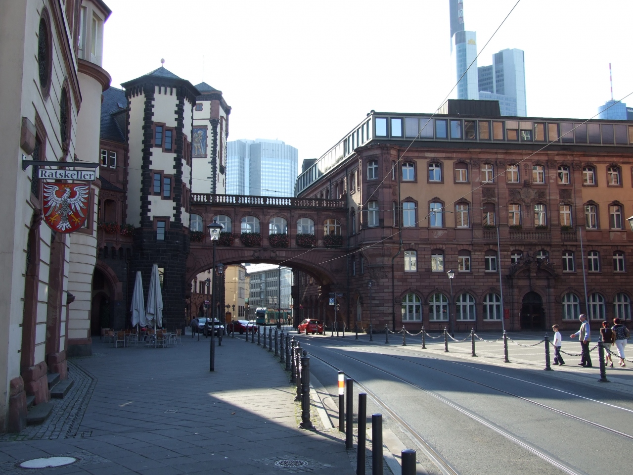 ドイツ航空路の中心、近代的な街並みが広がるフランクフルト・アム・マイン。中央駅から二キロほどの場所に、旧市街があります。歩くには遠すぎるので、市電など公共交通機関利用するのが良いでしょう。旧市庁舎を中心とする、レーマー広場です。