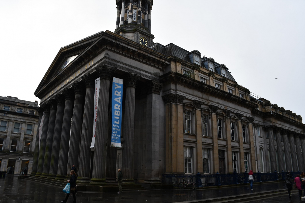 グラスゴー中央駅からも近い、街の中心部にあります。建築は古代ギリシア風ですが、そもそも建物の前にあるウェリントン侯爵の銅像に道路工事用の標識が被せてあるなど、現代美術を意識したようです。展示品は現代美術です。