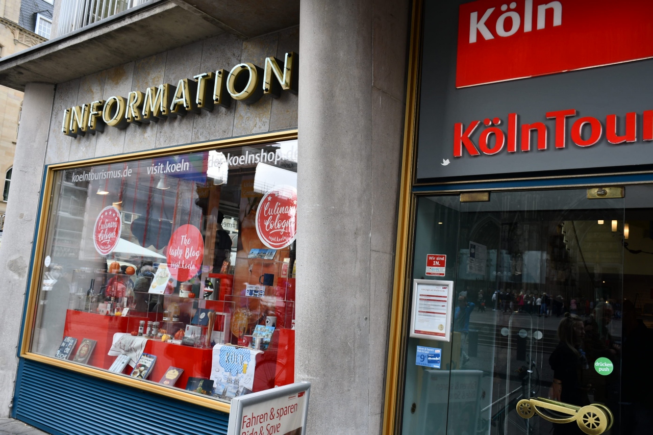 ケルン大聖堂の正面にあります。中央駅からも、歩いて五分ほどです。広い観光案内所で、十人ぐらいの職員が応対しています。絵葉書や、ちょっとしたお土産物も売っています。周辺は大聖堂の他に、ルートヴィヒ美術館やローマ・ゲルマン博物館など見所が集まっています。