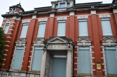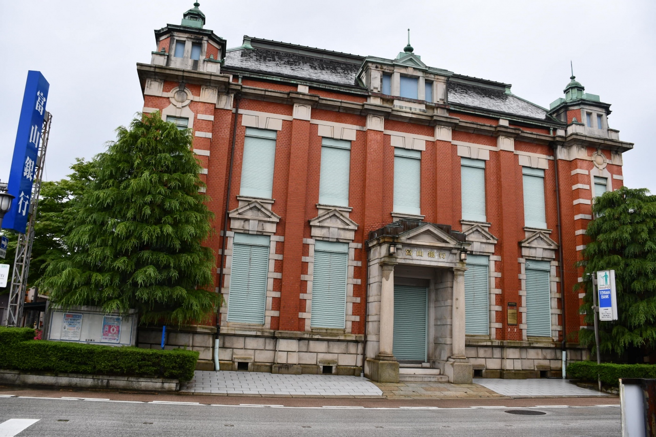 越中の国、高岡は太平洋戦争の空襲がなかったのでしょうか、古い街並みが残っています。山町筋は高岡駅から歩いて十分ちょっとです。蔵や格子造りの街並みで、一際目立つのが煉瓦建ての富山銀行本店です。清水建設の創業者が富山出身だったという縁で建ったそうです。